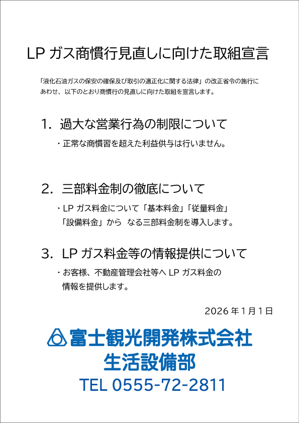 富士観光開発株式会社生活設備部は、LPガス業界の新制度の下で商慣習是正を推進していくため、「LPガス商慣行見直しに向けた取組宣言」を行います。 【富士観光開発株式会社生活設備部】LPガス商慣行見直しに向けた取組宣言